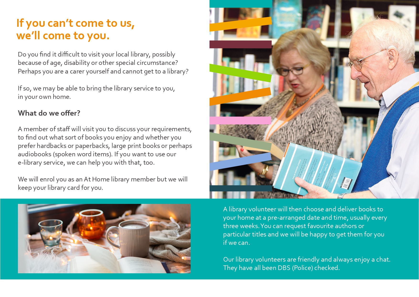 If you find it difficult to visit your local library and are unable to get to us, possibly because of age, disability, lack of access to transport or caring responsibilities, our At Home Library Service may be able to deliver books to you.